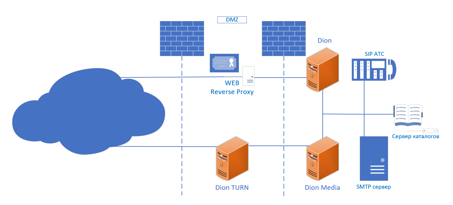 В данном примере сервисы Dion Media и Dion TURN вынесены на отдельные серверы.