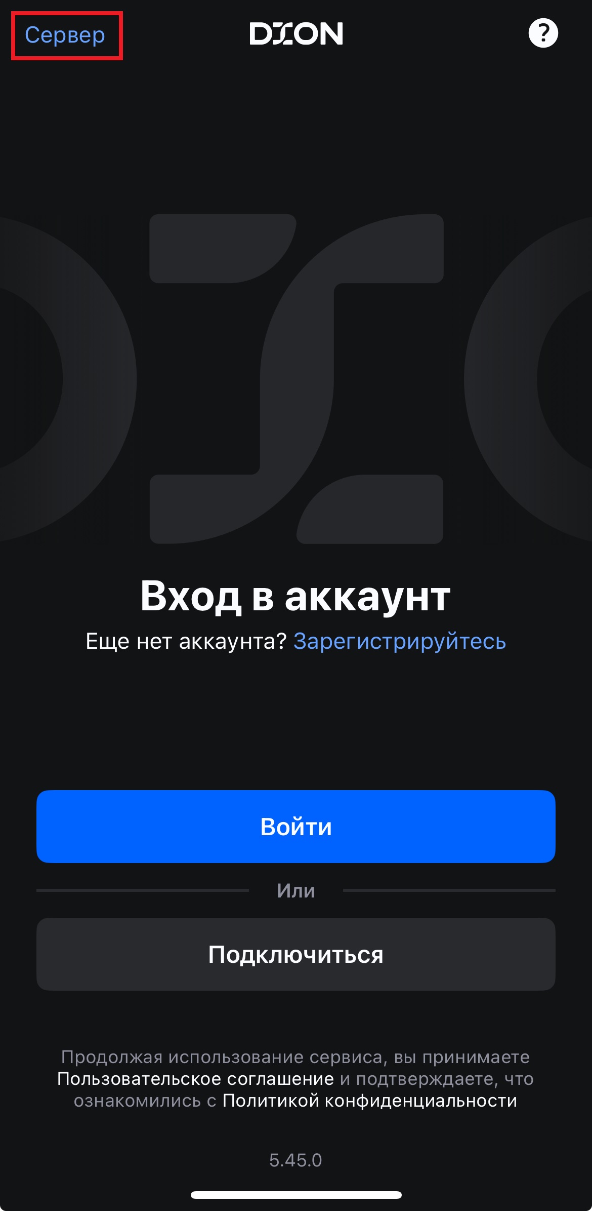 Укажите адрес сервера, к которому будет подключаться приложение (dion.<YourDomain>.com), и нажмите Подключиться к серверу.